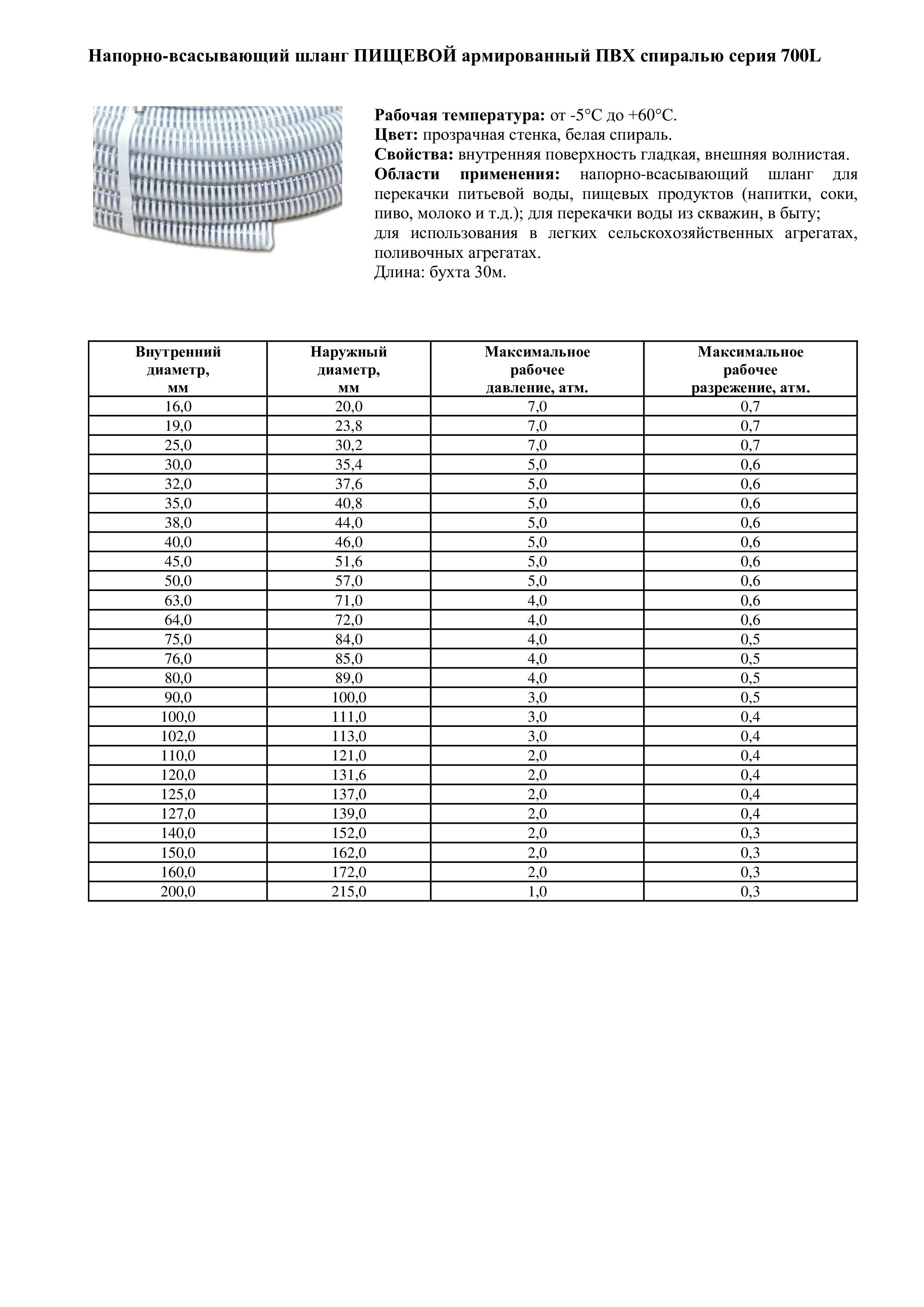 Шланг ПВХ 30 мм. напорно-всасывающий 5атм, пищевой (класс П), 700L, спираль ПВХ