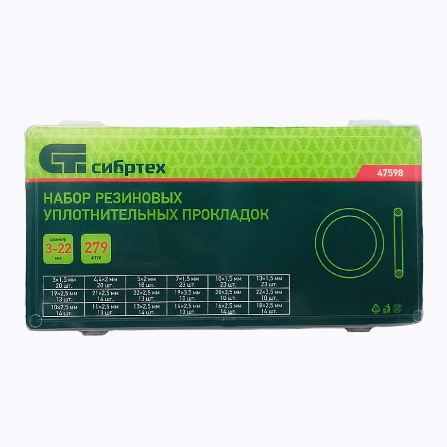 Набор резиновых уплотнительных прокладок СИБРТЕХ D 3 - 22 мм 279 предметов 47598 поставляется в компактном кейсе из пластика, который обладает отсеками под каждый размер и нумерацией размеров на крышке.